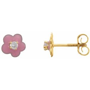 14K Yellow 2 mm Round Cubic Zirconia Youth Pink Enamel Flower Earrings